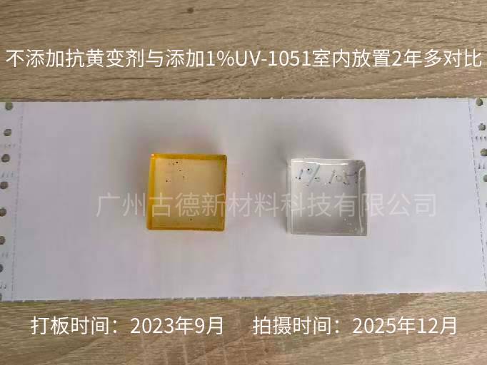 抗黃變劑UV-1051作為UV-1050的升級(jí)產(chǎn)品,繼承了優(yōu)異的抗紫外線性能外,著重提升了環(huán)氧樹脂其室內(nèi)抗黃變和抗熱老化性能。